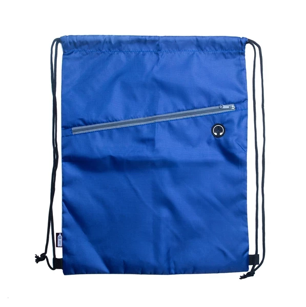 Plecak wykonany z RPET 210D, z kieszonką na zamek oraz otworem na słuchawki. Materiał wyprodukowany z przetworzonych plastikowych butelek.